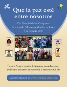 Reserva la fecha para el Día Mundial Cuáquero. El tema para el Día Mundial Cuáquero, el domingo 4 de octubre de 2026, será Que la paz esté entre nosotros.
